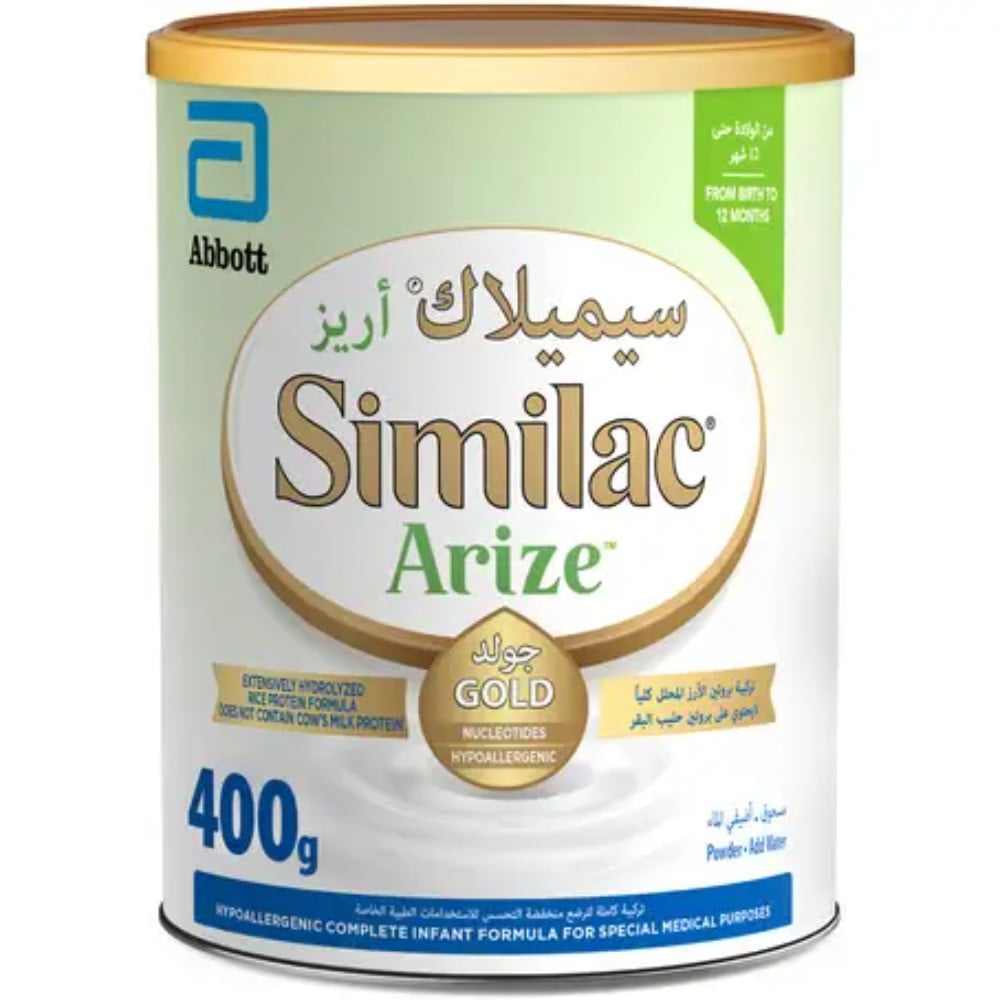 وصف المنتج:سيميلاك أريز جولد حليب الأطفال بتركيبة تعتمد على بروتين الأرز المحلل كليا ، و خالٍ من بروتين البقر.تركيبة منخفضة التحسس و مصممة لتلبية الاحتياجات الغذائية لدى الرضع الذين يعانون حساسية بروتين حليب البقر.خالٍ من اللاكتوز حيث أنه لا يحتوي على أي من مكونات حليب الأبقار.سهل الهضم و خفيف على معدة الرضع.يساعد على تحسين نمو الطفل و تحسين عملية الهضم.مميزات المنتج:يحتوي على (HMO) وهو مكون موجود طبيعيا في حليب الأم ليدعم مناعة الأطفال الذين يعانون من حساسية بروتين حليب البقر.يحتوي على حمض دوكوساهيكسانويك وحمض أرشيدونيك وهما من أحماض أوميغا 3 الدهنية الموجودة في حليب الأم و التي تساعد في التطور الذهني والبصري واللغوي.تركيبة خاصة من الدهون الخالية من زيت النخيل، مثبت طبيا انه يساعد على امتصاص الدهون الكالسيوم لعظام قوية.متكامل من الناحية الغذائية، وبالتالي يمكن أن يحل محل التركيبة العادية ويضمن النمو الأمثل.إرشادات الاستخدام:استعمليه و أرضعي طفلك حسب توجيهات الطبيب.إن ظروف النظافة الملائمة و التداول و التخزين كلها أمور مهمة عند تحضير تركيبة الرضع.إذا قمت بإعداد أكثر من وجبة واحدة، يجب تخزينها في الثلاجة (2-4 درجة مئوية)، و تستخدم في غضون 24 ساعة، و يجب رجها قبل الإطعام.التحذيرات والاحتياطات:يمكن حفظ العلبة قبل فتحها في درجة حرارة الغرفة العادية ( لا تتعدى 25 درجة مئوية)، و بعد فتح العلبة يجب استعمال محتوياتها خلال ثلاثة أسابيع.لا تستعملي فرن الميكروويف لتحضير التركيبة أو لتدفئتها.يستخدم تحت إشراف طبي.