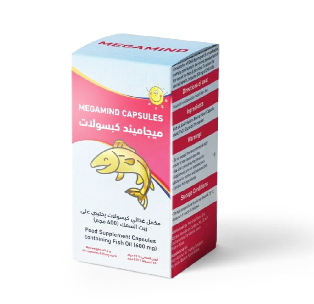 الوصفميجامايند اكسترا Megamind extra 60 chewable tabletsلصحة الجسم من اضطراب نقص الانتباه مع فرط النشاط (ADHD) صيغة فريدة (قرص قابل للمضغ)طعم مستساغ (نكهة الليمون)أوميغا 3 الدهون غير المشبعة المتعددة (DHA) ___ فوائد ميجا مايند اكسترا:-– السيطرة على سلوك الطفل ، وزيادة القدرة على التعلم.– تقليل أعراض ADHA والمساعدة على النوم.– تعزيز تطور الجهاز العصبي للأطفال.– هام لوظيفة العين الطبيعية والصحية والرؤية الواضحة.– له تأثير حماية القلب الذي يعزز النمو دون أي إجهاد على عضلة القلب.– زيادة مناعة الصدر ضد عدوى الجهاز التنفسي الشائعة.– ميجامايند ضروري لنمو الدماغ والجهاز العصبي المركزي.– السيطرة على النشاط الحركي للأطفال وتقليل أعراض ADHA والمساعدة على النوم والتنمية الاجتماعية.-يعزز وظيفة العين الصحية ورؤية واضحة مدى الحياة.– إعطاء الأطفال الصغار وأطفال المدارس مناعة قوية ضد التهابات الجهاز التنفسي الشائعة في دور الحضانة والمدارس.– يساعد الجسم على الحفاظ على مستويات الدم الطبيعية من الكالسيوم والفوسفور ، وهما من المعادن الأساسية لبناء كتلة العظام.– يساعد الجسم على تكوين خلايا الدم الحمراء والهرمونات الكظرية التي تنظم التمثيل الغذائي والجهاز المناعي وضغط الدم. ___ الجرعة: قرص واحد / مرة واحدة يومياً